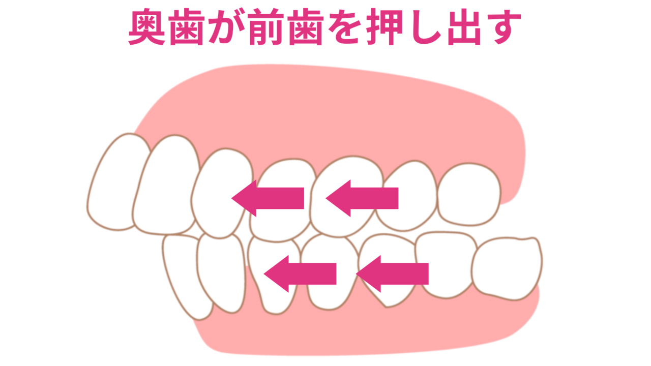 歯並びが悪い人は奥歯が斜めに生えている方が多いのですが、何万回も奥歯でモノを噛んでいる内に徐々にその傾きがひどくなり、やがてその奥歯が前歯を押し出してしまいます。