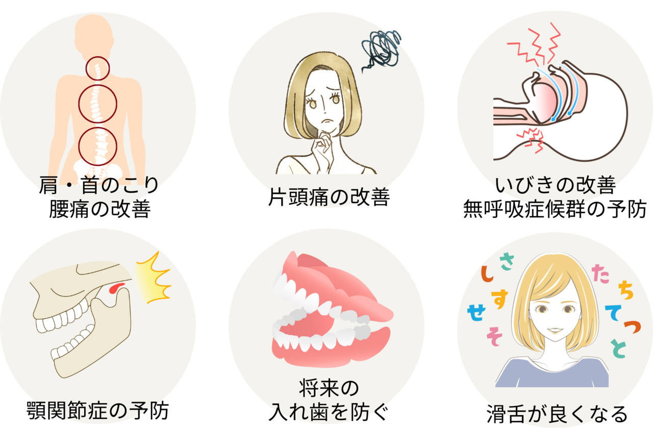 さらに顎関節症の改善、いびきの改善、滑舌が良くなる、虫歯や歯周病になりにくい、といった効果も期待できます。