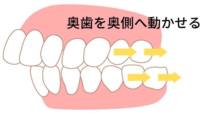 前歯をキレイに並べるスペースが足りない場合、たとえば奥歯を奥側に動かすことで、前歯を並べるスペースを確保します。