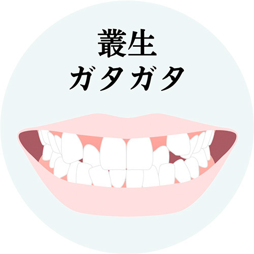 叢生(そうせい)は、ガタガタとかガチャ歯、乱杭歯(らんくいば)ともいわれる、歯と歯が重なってデコボコした症状。