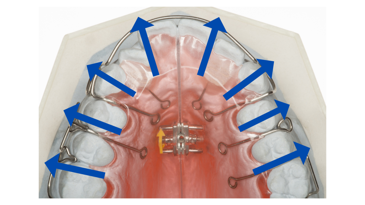 拡大床とは、歯列(あごのアーチ)を頬側に広げるための装置です。